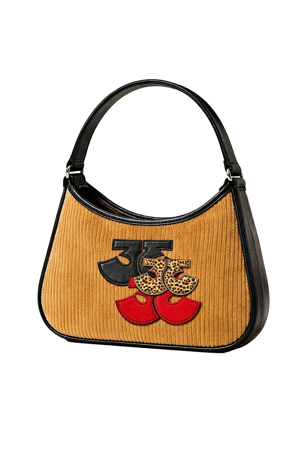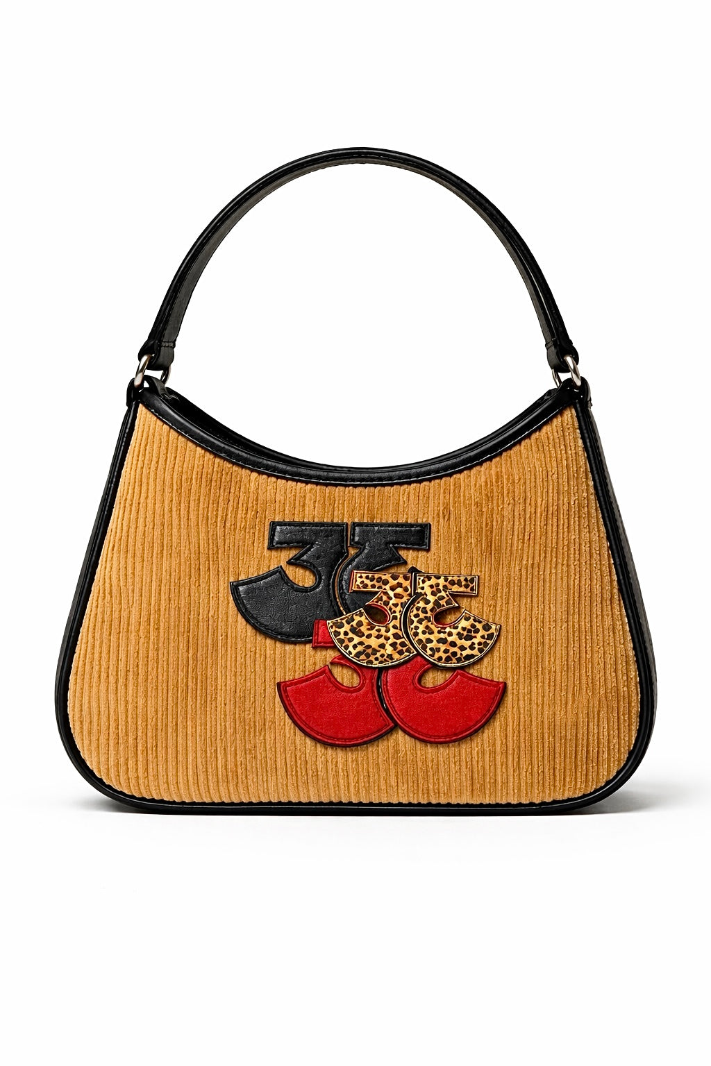 The TRӠYON ARC is sculpted movement in material form — a fluid silhouette built from structured intention. Crafted in rich tan corduroy with precision black leather framing, the ARC curves naturally against the body, creating a soft yet powerful presence. At the center sits the signature layered TRӠYON emblem — black leather foundation, cheetah-textured overlay, and deep red leather base — individually cut, stacked, and stitched for dimensional impact. It’s not printed. It’s built.