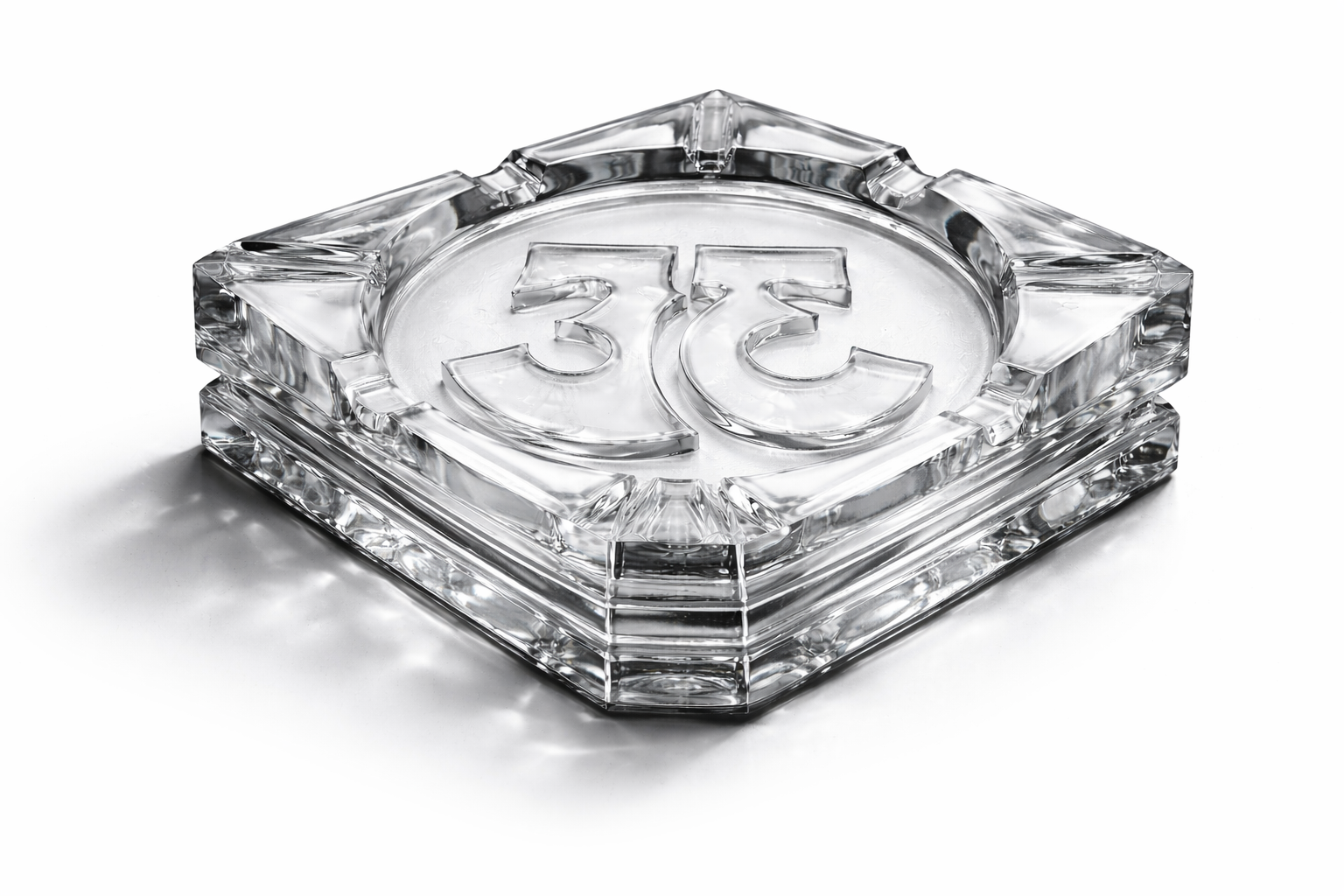 ARCTIC REGALIA is cut from dense, high-clarity glass and structured with a stepped foundation that delivers weight and permanence. Every facet is sharpened to capture light with precision, allowing the geometry to speak without distraction. At the center, the TRӠYON emblem is sculpted in raised polished crystal, clean, defined, and deliberate. The absence of smoke or tint exposes the construction in its purest form.